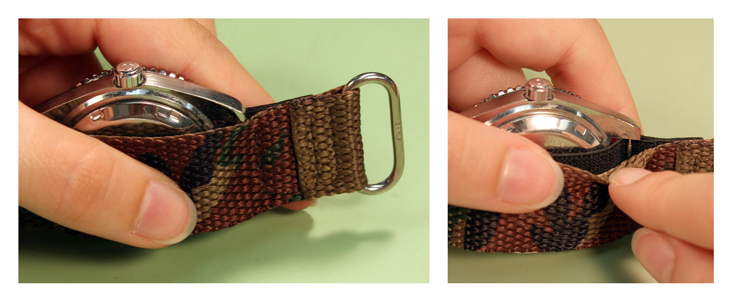 Step 6#6) Hold onto the watch case as you pull the second spring bar out from between the lugs. Set the watch case down on your space and place the spring bar in your parts tray. Step 7#7) When the band has been removed, you will want to measure the watch band to find the right size replacement band. Then, with the size of the band, you can check out our wide selection of watch bands to find the perfect replacement band. Step 8#8) Once you have the replacement band in hand, you can attach the watch case to it. Lay out the new watch band and determine which way you want the band to clasp. Then, lay the watch case out on top of the band so it will sit the correct way on your wrist once you attach it to the watch band. Step 9#9) After you have figured out all the positioning details, you will need one of your spring bars. Since these watch bands do not come with spring bars, if your original spring bars are in good condition, you can reuse them here. If not you will need to order new spring bars. Step 10#10) Hold the watch band and take the watch case, lining it up so the lugs fall on either side of the elastic strap. Next, take your first spring bar and slide it between the nylon strap and elastic strap until you can position the end of the spring bar in the bottom lug of the watch case. Step 11#11) Using the forked end of your spring bar tool push down on the spring bar so you can slide it under the upper lug. Move the spring bar around until it pops into place. Don't worry if it takes you more than one try to get it into place. Step 12#12) Turn the watch case so you have a good view of other set of lugs that need a spring bar. Position the lugs so that the elastic band sits between them. Take the second spring bar and insert it between the nylon and elastic straps. Position the bottom end in the notch in the bottom lug of the watch case. Step 13#13) With the spring bar partially in position, take your spring bar tool and push the free end down with the forked end of the tool. Carefully slide the spring bar under the lugs and release the pressure on it. Move the spring bar around until it pops into place in the lug. FINISHED!Once you are certain that both spring bars are securely positioned in the watch case under the elastic strap, you can put your watch on and continue to wear it again. ¡¡ |