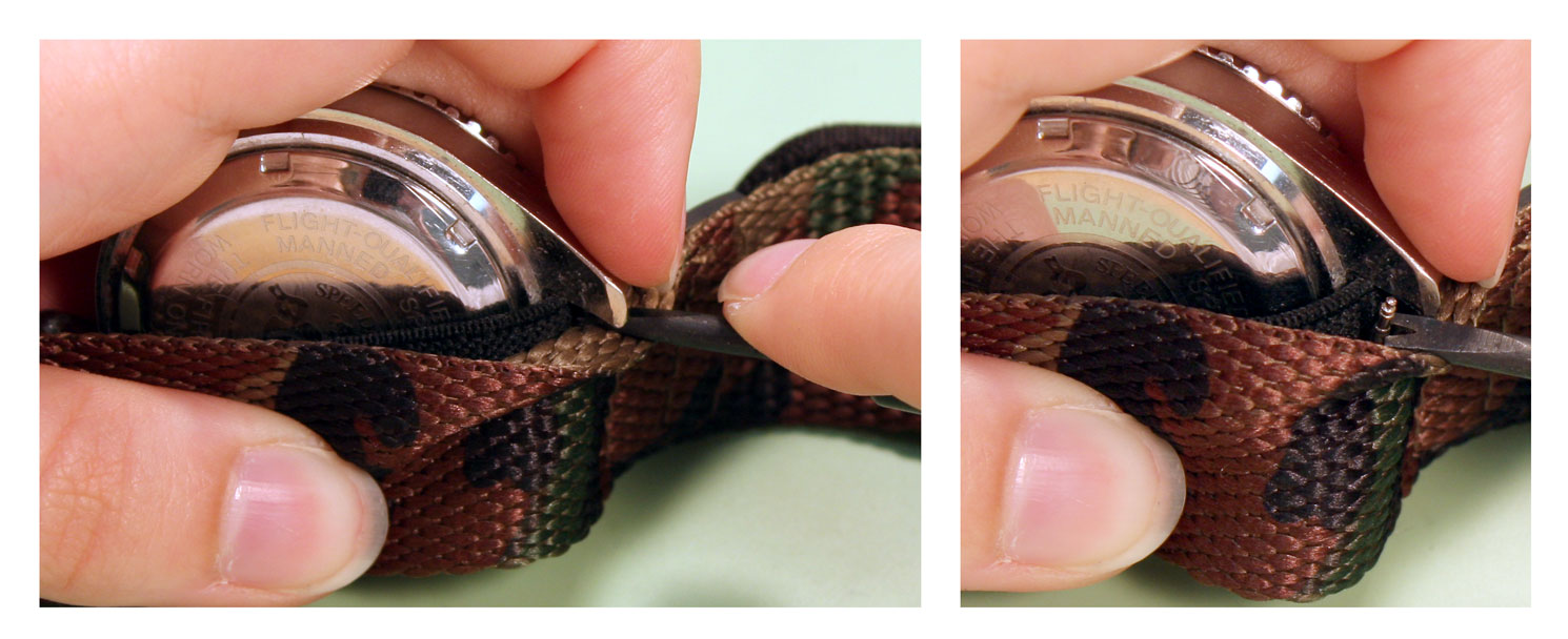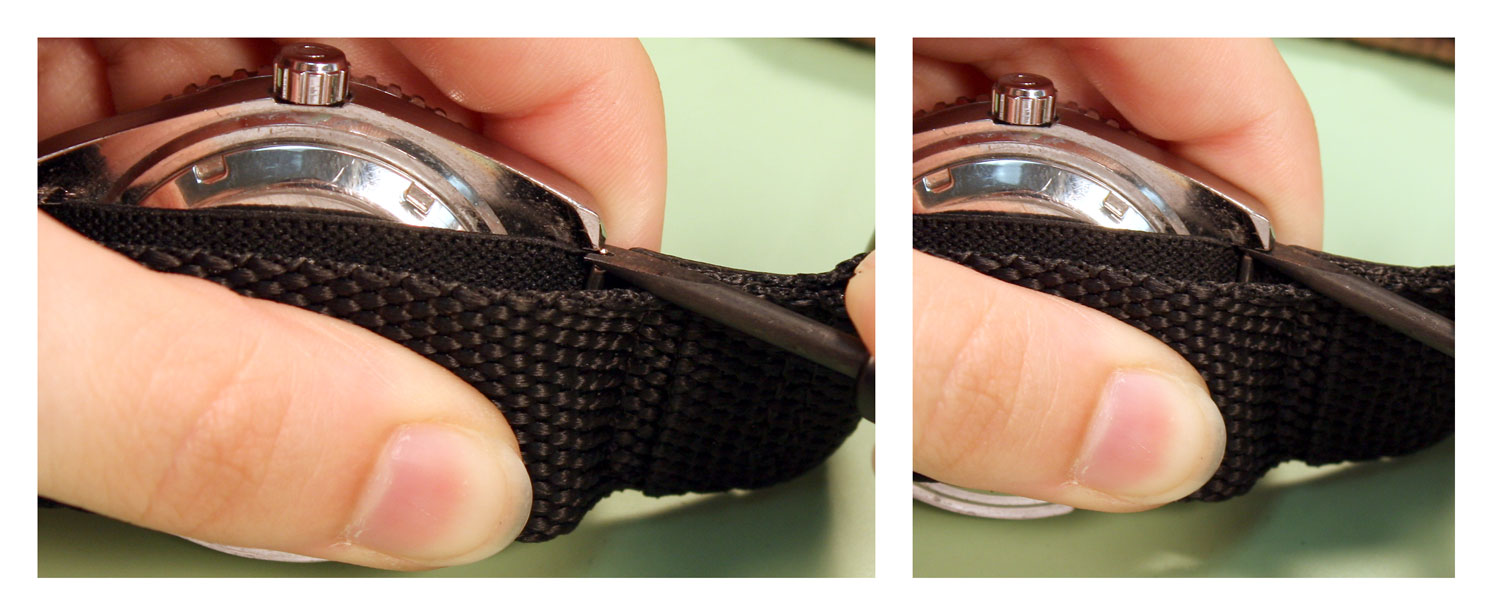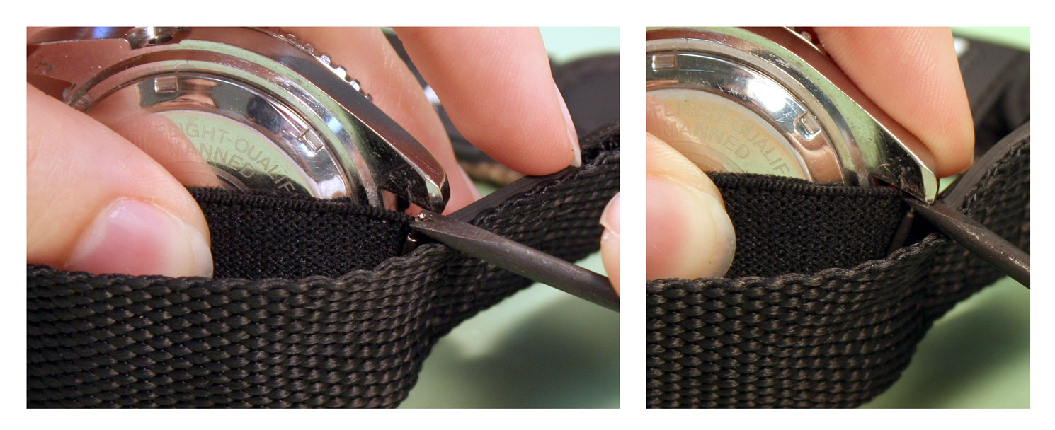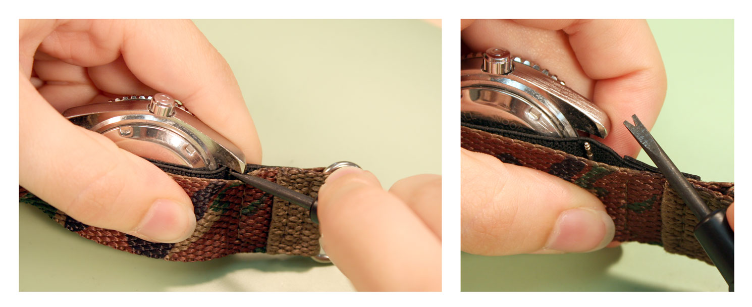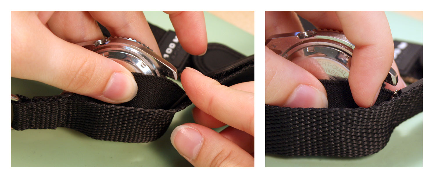 How to Replace a VELCRO AND NYLON SPORT Watch BandJust like any other watch band, you can replace the band when it starts to wear out, or just replace the band to change the style. The nylon and Velcro style watch bands are extra flexible because they can attach to any watch case that holds the band in place with spring bars. To change a nylon and Velcro band or add one to your watch, you can use this guide on how to remove and replace your rubber watch band. Tools Needed: Step 1#1) The first step is to remove the old band from your watch case. Take the watch in your hand and hold the case so that the back is facing you, balanced on its side. You should be able to see the top edge of one spring bar here ¨C you may have to move the nylon back to reach the spring bar. Step 2#2) Take your spring bar tool and insert the forked end into the space there so it sits above the donut ring holding it in place. With the point held against the donut ring on the spring bar, push down so the band collapses in on itself. Then push the spring bar out from under the lugs. Step 3#3) Once the spring bar is free of the lug, it should fall free onto your work surface. Pick it up and put it in your parts tray to keep it from getting lost. The first side of the watch case will be free of the elastic strap on the band now. Step 4#4) Turn the watch around so that you can access the other set of watch lugs from the back of the watch case. Again, pull back the nylon back strap to expose the spring bar if necessary. Step 5#5) Take the forked end of your spring bar tool and insert it between the lugs so that it catches above the donut ring on the spring bar. Push down on the spring bar with your spring bar tool until it collapses and you can slide the end out from under the watch lugs.