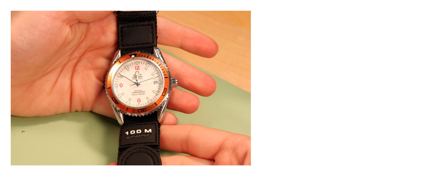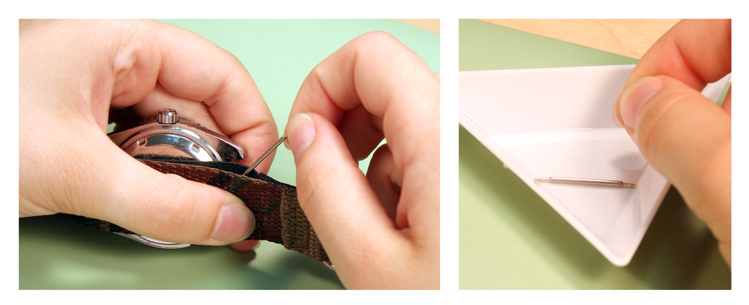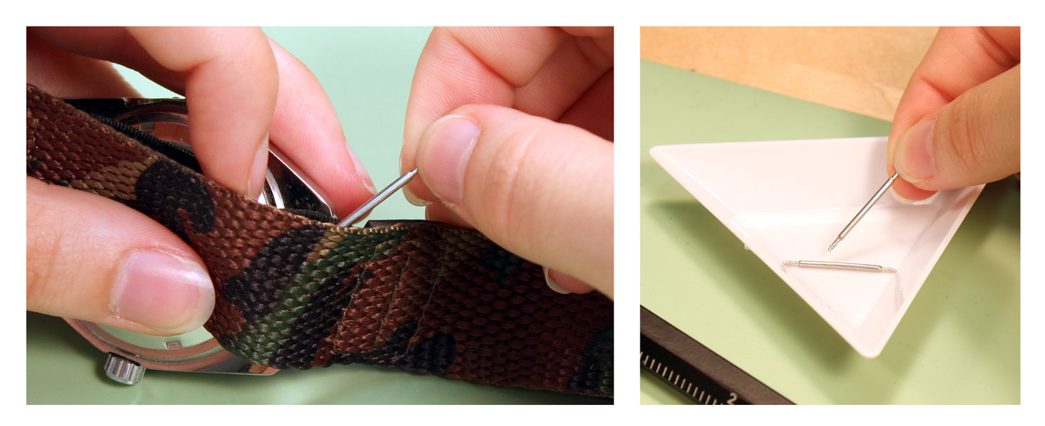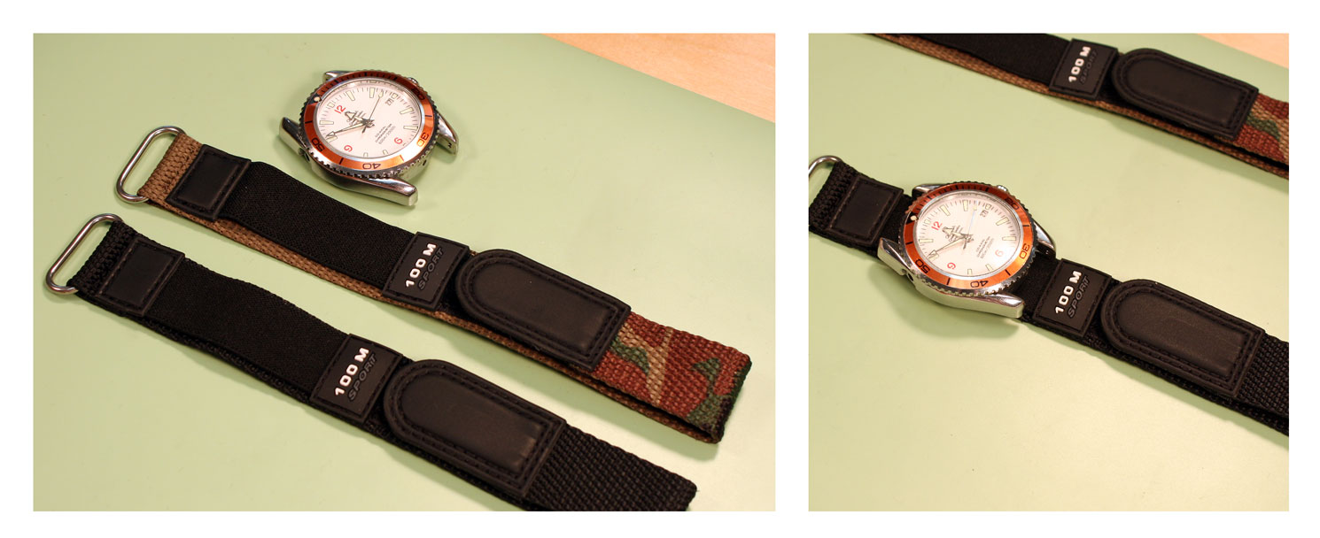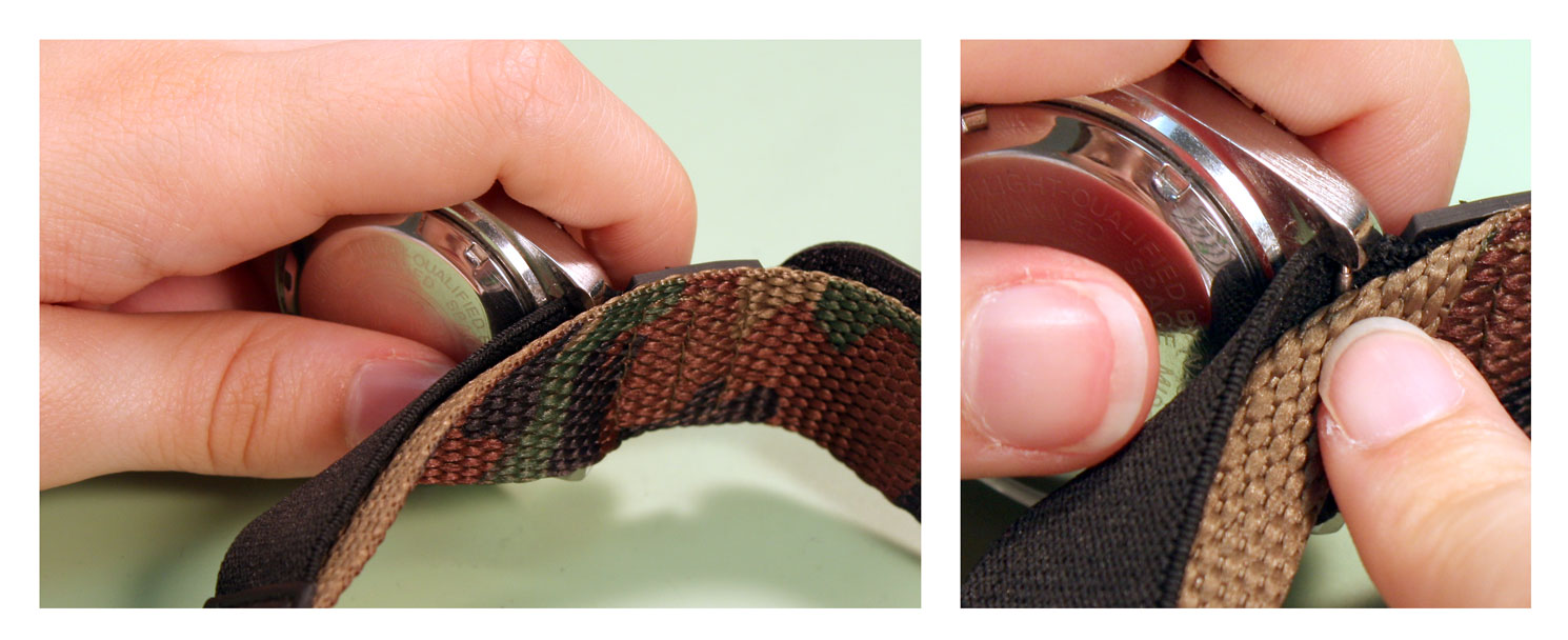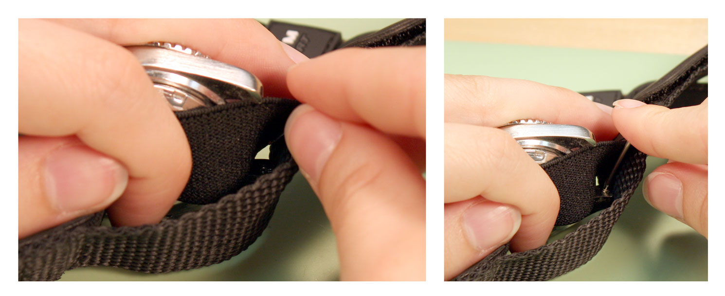 How to Replace a VELCRO AND NYLON SPORT Watch BandJust like any other watch band, you can replace the band when it starts to wear out, or just replace the band to change the style. The nylon and Velcro style watch bands are extra flexible because they can attach to any watch case that holds the band in place with spring bars. To change a nylon and Velcro band or add one to your watch, you can use this guide on how to remove and replace your rubber watch band. Tools Needed: Step 1#1) The first step is to remove the old band from your watch case. Take the watch in your hand and hold the case so that the back is facing you, balanced on its side. You should be able to see the top edge of one spring bar here ¨C you may have to move the nylon back to reach the spring bar. Step 2#2) Take your spring bar tool and insert the forked end into the space there so it sits above the donut ring holding it in place. With the point held against the donut ring on the spring bar, push down so the band collapses in on itself. Then push the spring bar out from under the lugs. Step 3#3) Once the spring bar is free of the lug, it should fall free onto your work surface. Pick it up and put it in your parts tray to keep it from getting lost. The first side of the watch case will be free of the elastic strap on the band now. Step 4#4) Turn the watch around so that you can access the other set of watch lugs from the back of the watch case. Again, pull back the nylon back strap to expose the spring bar if necessary. Step 5#5) Take the forked end of your spring bar tool and insert it between the lugs so that it catches above the donut ring on the spring bar. Push down on the spring bar with your spring bar tool until it collapses and you can slide the end out from under the watch lugs.